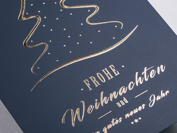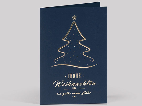 Dunkelblaue Weihnachtskarte aus Soft-Touch-Karton mit goldgeprägtem Weihnachtsbaum und Gruß Frohe Weihnachten und ein gutes neues Jahr.