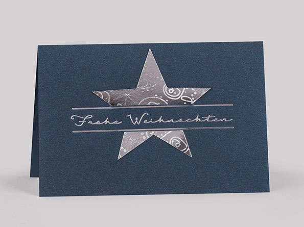 Blaue Firmen-Weihnachtskarte aus Metallic-Karton mit silbernem Stern und Einlegeblatt