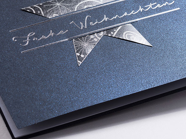 Diese originellen Firmen-Weihnachtskarten in edlem Blau beeindrucken mit einem festlichen, modernen Design. Der schillernde Metallic-Karton sorgt für einen hochwertigen Look, während die Stern-Applikation aus Silberfolie auf der Vorderseite den Weihnachtszauber perfekt einfängt.